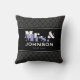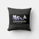 Personalised Mr and Mrs throw pillow elegant style. Cute wedding gift idea for newly weds. Personalise with name of bride and groom / husband and wife. Classy pattern design with stylish typography. Lavender purple / lilac, grey, white and black colours. Sylish home decor present for newlyweds.