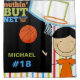 Boys basketball theme shower curtain for the boy who loves and plays basketball, features a stick figure boy with black hair, basketball, basketball net and backboard, text that reads Nuthin' But Net, and an area you can easily personalise with his name and jersey number!