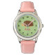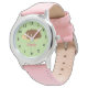 Personalised name cute pink hedgehog girls watch. Personalizable wrist watches for small children. Girly Birthday or Christmas gift idea for little girls. Sweet forest animal vector design. Make your own timekeeper for daughter, stepdaughter, granddaughter, grandchild etc. Add your own custom name or monogram letters of child. Green polka dots background pattern. Script typography template. Pink leather band.