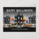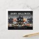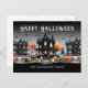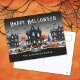 Send a playful Halloween greeting with this fun and festive postcard. Or you can even change this to a Halloween festival or market invite or business related Trunk Or Treat event. Featuring a simple black and white design, the front showcases a haunted house with orange accents from a spooky tree, pumpkins, and jack-o'-lanterns. Cute ghost and bat details complete the whimsical look. The typography features an elegant vintage grunge serif font that adds a touch of spooky sophistication to the design. Perfect for inviting friends to a Halloween party, sending spooky wishes, or adding a seasonal touch to your mail.