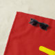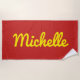 This simple beach towel design feature a personalised name in a yellow script-like font on a red background.