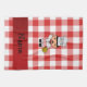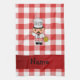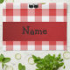 Cute Italian chef boy with chef jacket, black moustache, red tie, red white chequered apron, black hair, chef's hat, brown eyes and pizza and on a red white chequered pattern background and red stripe. Personalised with your name gifts or monogram gifts or your initials. Cute chef gift ideas for kids, boys and girls. Ideal for birthday's party. If you hit the customise it button you can change the colour and type of font.