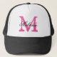 Personalised name monogram neon pink trucker hat for bride and bridesmaids . Vintage monogrammed name initial letter with stylish script typography. Cute wedding party favours for guests, friends and family. Make your own for bride to be and bride's entourage; brides maid, maid of honour, flower girl, matron of honour, mother of the bride, mother of the groom, ring bearer etc. Fun accessory for elegant marriage, classy bridal shower, fun bachelorette, engagement, anniversary, girls weekend trip, girls night out, ladies night etc.