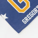 Cuddle up with a sports jersey-style blanket! This all-over pattern features a retro block font, stars, and is personalised with a monogram initial and name — perfect for individual names, family surnames or pet names. You can also customise the background colour by using the design editor tool. Custom fleece blankets are great for staying warm and cosy, and make a fun and useful gift for kids, teens, family, friends and loved ones. Printed colours: yellow gold, dark blue navy and white.