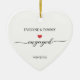 Elegant ceramic heart ornament celebrating an engagement, featuring customisable names, a beautiful script "engaged" with a red heart accent, personalised names and date. Perfect engagement gift or wedding shower keepsake. Available in white ceramic with gold hanging ribbon.