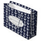 Personalised large gift bag with nautical anchors pattern. Navy blue and white colours with oval label. Elegant gift bags for fancy occasions like beach destionation wedding, bridal shower, engagement, anniversary or baby shower. Classy typography for name, funny quotes or sayings. Cute party favour bag for bride and bridesmaids. Luxury style design with boat anchor print. Also nice for maritime theme Holidays or Birthday of sailor, skipper, boat captain etc. Anchors aweigh! Big size bags for presents and accessories.
