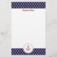 This stationery features a Moroccan Quatrefoil pattern in navy blue and white. A red anchor provides a nautical motif to the design. Personalise this stationery with a name.
