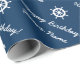 Personalised nautical ship wheel blue and white wrapping paper for Birthday or Christmas Holidays. Custom giftwrap with congratulatory message. Personalizable name with custom Happy Birthday congratulations text. Customisable navy blue background colour and elegant script text for your wishes or note. Surprise your friends, family, sailor, husband, wife, etc. Great gift wrap design for maritime theme party. Also fitting for themed graduation, anniversary, new home, new pet, beach wedding, promotions, pregnancy, new job, new boat or yacht, sailing and more.