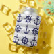 This decorative design features both a dark navy blue anchor and a boat wheel with white stripes. The nautical illustration creates a modern and unique can cooler with personalised text and favourite background colour.