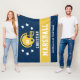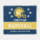 Personalised football themed fleece blanket for players when they're not scoring touchdowns on the field, and for their parents to support their kids and stay warm at chilly games! Makes a unique team gift. Design features a football helmet customised with the player's uniform number, custom text for the player's first and last name, and modern text for the team name. Stylish and modern design features sporty varsity jersey lettering and simple horizontal stripes with star accents. The colour scheme of navy blue, maize yellow, and white can be modified to coordinate with your team colours.