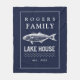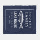 Dark blue lake house fleece blanket featuring a rustic trout image and bold serif typography. Personalise this design with your family name and year established. Further customise this design by selecting the "customise further" link.