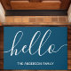Welcome guests with a warm and friendly greeting using this personalised doormat. Featuring a modern script "hello" in white on a stylish navy blue background, this customisable doormat adds a touch of charm to any entryway.