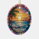 A Personalised Travel Souvenir Ornament designed to celebrate your unforgettable trip. Whether you went for work, enjoyed a romantic getaway, or took part in a school exchange program, this ornament commemorates a special moment you’ll always cherish and want to remember for years to come. This ornament features a stained-glass-style design of a beach with waves at sunset, creating a truly eye-catching piece.