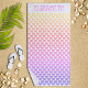 Add any name to this cute, bright pastel heart pattern in yellow, peach, orange, pink and purple beach towel for a perfectly unique gift.