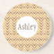 Stylish personalised coaster design features customisable centre name text with peach and gold chevron stripe background pattern.
