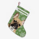 Funny cute christmas holiday stocking for your pet featuring a fawn red french bulldog, a traditional green background that can be changed to any colour, and a scattering of winter white snowflakes.