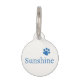 Simple design in blue and white with your pet's name and address, your phone number or text. And a matching paw print.