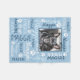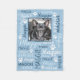 Blue Personalised blanket for your dog. Customisable with your dog or cat photo image with your dog or cat's name. When you change the name Maggie to your own pet's name it will change all the typographical names at the same time. Word cloud art typography. Different font type and styles in light blue, navy blue and white with paw prints.