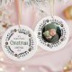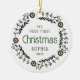 Celebrate baby's first Christmas with this keepsake ornament, featuring a Scandinavian style folk art wreath of doodled greenery and flowers. The word "Christmas" appears in green. Personalise the ornament with baby's name and the year in black sans serif font on one side and your favourite photo on the other.