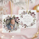 Celebrate baby's first Christmas with this keepsake ornament, featuring a watercolor wreath of purple and green leaves, purple berries and pink flowers. The word "Christmas" appears in delicate purple handwriting script. Personalise the ornament with baby's name and the year in purple sans serif font on one side and your favourite photo on the other.