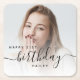 Modern birthday party paper coasters featuring a custom photo. Easily replace the sample image with a photo of the guest of honour. The word "birthday" appears in elegant black handwriting script. Personalise the text with the name and birthday year in black sans serif font. A white gradient overlay helps make the text pop.