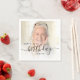 Modern birthday party napkins featuring a custom photo. Easily replace the sample image with a photo of the guest of honour. The word "birthday" appears in elegant black handwriting script. Personalise the text with the name and birthday year in black sans serif font. A white gradient overlay helps make the text pop.