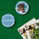 Personalised poker game chips with a custom photo and your own text (family name, established year, etc). This design in light blue includes the number 1000 but it can be edited with any value amount.