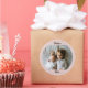 Your unique photo and two lines of personalised text highlight these custom polka time round stickers.