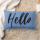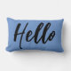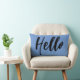 Trendy Custom Pillow Words Decorative | Hello. Cool pairng with custom pillow word Gorgeous. Displayed is blue colour pillow with black lettering custom word Hello. Customise to any colour pillow or custom word for your furniture accent and home decoration. pair with custom pillow word gorgeous pillow.