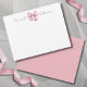 This simple and elegant monogrammed note card design features a large watercolor pink bow centred at the top, with the first name displayed on the left and the last name on the right in classic serif font. The back of the card is designed in a coordinating soft pink colour, adding a cute and cohesive touch.