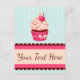 Postcard with pink cupcake and cherry on mint blue striped background.