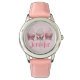 Watch features an original marker illustration of a pink frosted cupcake with sprinkles and a bow. Simply personalise with the wearer's name!