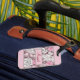 This luggage tag features a floral cabbage rose pattern in shades of pink and mauve with your name personalised in elegant dark pink script. The tag is bordered with a band of coordinating light pink and adds a stylish and elegant look to your luggage