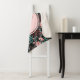 Blanket with an elegant pattern made with pink flowers, teal leaves, and red berries on a dark background.