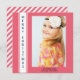 Personalised pink and white photo Merry Christmas greeting card with vertical text and a pink and white striped back.