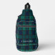 Custom Clan Black Watch tartan blue green and dark grey check design sling bag. Perfect gift for family, dad, husband or other special gift giving occasions. Celebrate all things tradition and family clan with this cool Clan Black Watch tartan print sling bag. Add a name by clicking the "Personalise" button above or delete the placeholder name to make this a plain tartan sling bag.