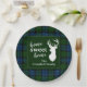 Cute home sweet home Christmas paper plates you can easily customise by clicking the "Personalise" button, Featuring deer silhouette and clan Campbell Military tartan in green blue chequered pattern.
