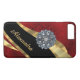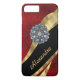 Personalise this pretty chic and elegant girly dark red vintage damask pattern design, with a crystal rhinestone jewel bling and black and gold swirl ribbon pattern graphic with her name or monogram initials to the customisable text templates to create a special unique stylish case to protect your device. This chic elegant sophisticated feminine red retro damask graphic design, would be great for women who like romantic red and jewellery easily add your own name or text to the stylish elegant colour ribbon template. Visit the CUSTOMIZEDSKINS STORE for matching cases. PLEASE NOTE the golden colour is not metallic, and does not contain real diamonds or crystals.