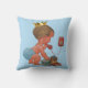 Personalised elegant vintage little prince blue throw pillow. A beautiful vintage illustration of a cute and adorable baby boy with stylish blue diaper and a gold crown. He is talking on an old red retro telephone telling you that he is on his way! He is holding a little blue suitcase and his quirky teddy bear is leaning against it - he's all packed up and ready for his arrival! The background is a pretty blue colour with grey customisable text. Perfect for a baby shower gift / new baby gift. If you need any assistance customising your product please contact me through my store and I will be happy to help. I have matching products in my store.