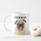I am in love with this beautifully detailed watercolor illustration of a smiling tan pug with black mask and ears! Personalise these mugs and tumblers with your name or monogram and even and change the handle colour to compliment your decor! Shop the rest of my collection for the sweetest housewarming, bridal shower, teacher, mother-in-law, husband, boyfriend, secret santa, or tough-to-shop-for gifts! To see more work and learn about this artist, visit her at: www.theprintsprincess.com and www.instagram.com/theprintsprincess