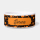 This custom dog bowl features a cute scattered pumpkins and paws pattern with orange pumpkins and paws on a black background.
