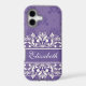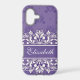 Elevate your phone's style with this elegant and personalised phone case featuring a rich purple background adorned with intricate white floral and paisley patterns. A central white banner provides a chic space for a customised name. ,The design combines a classic damask look with bohemian and vintage floral motifs, creating a sophisticated and timeless accessory. The case is designed to provide protection while maintaining a slim and stylish profile