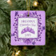 Fluttering purple butterflies tree ornament is versatile for plum or lavender theme colours. Butterflies and gemstone tiara can easily be resized and repositioned on Christmas tree ornament. Say congratulations with a purple princess design. Decorative, leafy border beautifully surrounds your message.