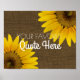 Create your own floral, rustic country burlap look sign with personalised quote- Matches rustic country decor, and rustic burlap theme retirement or birthday parties or outdoor barn weddings, garden weddings, or country fall or autumn weddings. Shabby brown burlap cloth look background with elegant script and modern fonts. Jumbo, sunny yellow sunflowers adorn upper and lower corner. Note: All images are printed. Not actual burlap cloth. Use the Customise It button- You can even change the font styles, sizes, colours, or placement. Complements vintage wedding decor, floral wedding decorations, or outdoor garden parties, and summer or fall birthday party decor. We have matching country sunflower wedding supplies and paper goods in our Zazzle.com/angela65 shop.