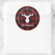 The product design features a silhouette of a deer on a classic red and black buffalo plaid pattern. Combined with your own personalised text, this composition makes farmhouse country-style, modern, and unique stickers for family reunion, Christmas, and any other special occasions.