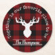 The product design features a silhouette of a deer on a classic red and black buffalo plaid pattern. Combined with your own personalised text, this composition makes farmhouse country-style, modern, and unique round coasters for Thanksgiving, Christmas holiday, family reunion, or any other special gatherings!