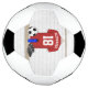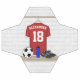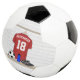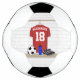 A fresh new version of GiftsBonanza's unique football soccer jersey sports design featuring a red and white soccer jersey hanging in a locker room with a soccer ball, water bottle and football cleats on the bench. The soccer jersey has customisable text for the name of the soccer player, soccer coach or soccer fan and number or age.