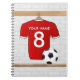 A personalised football soccer jersey in red with white trim, hanging in a sports locker room with a water bottle, football cleats and a soccer ball. Just add the name and number (or age) of the soccer player, football fan or soccer team coach to create a unique soccer gift.