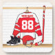 A unique and fun sports design with a personalised ice hockey jersey hanging in a locker room with a helmet, ice skates and a hockey stick. The jersey can be fully personalised with the number and name of your choice to make a great gift for any ice hockey fan, ice hockey coach or ice hockey player.
