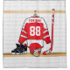 A unique and fun sports design with a personalised ice hockey jersey hanging in a locker room with a helmet, ice skates and a hockey stick. The jersey can be fully personalised with the number and name of your choice to make a great gift for any ice hockey fan, ice hockey coach or ice hockey player.